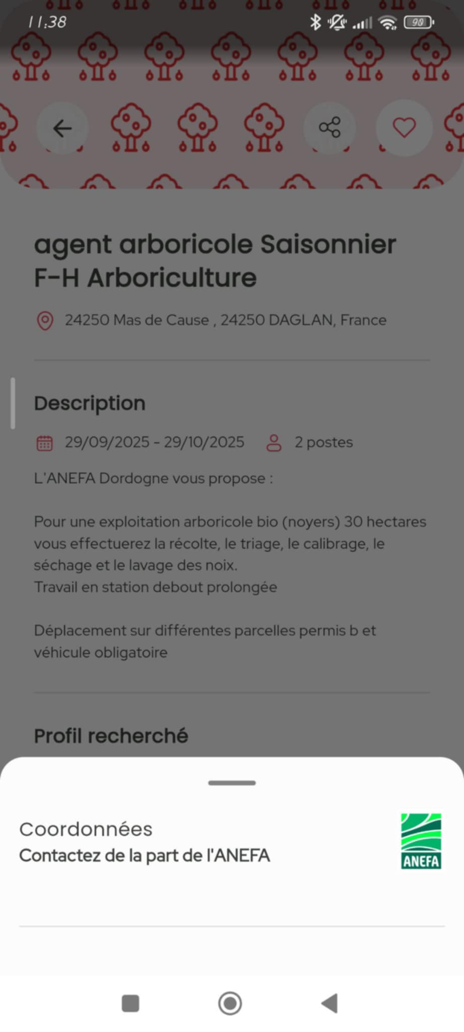 Offre vendangeur à Pomport 24240 – SARL Vignobles Pelletant (OFR-060908-24) : la fiche employeur est correcte sur lAR et sur Jobopré, mais les coordonnées ne s’affichent pas sur l’application.